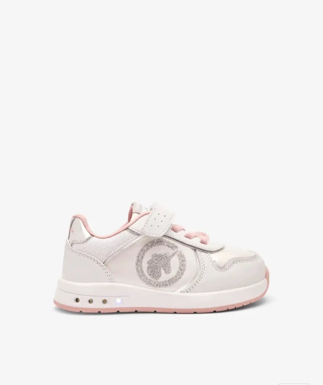 Disponibles en color blanco con marino y blanco con rosa, combinaciones modernas y versátiles, perfectas tanto para niño como para niña. Las luces integradas en la suela se activan al caminar, haciendo de estas deportivas un modelo irresistible para el día a día.